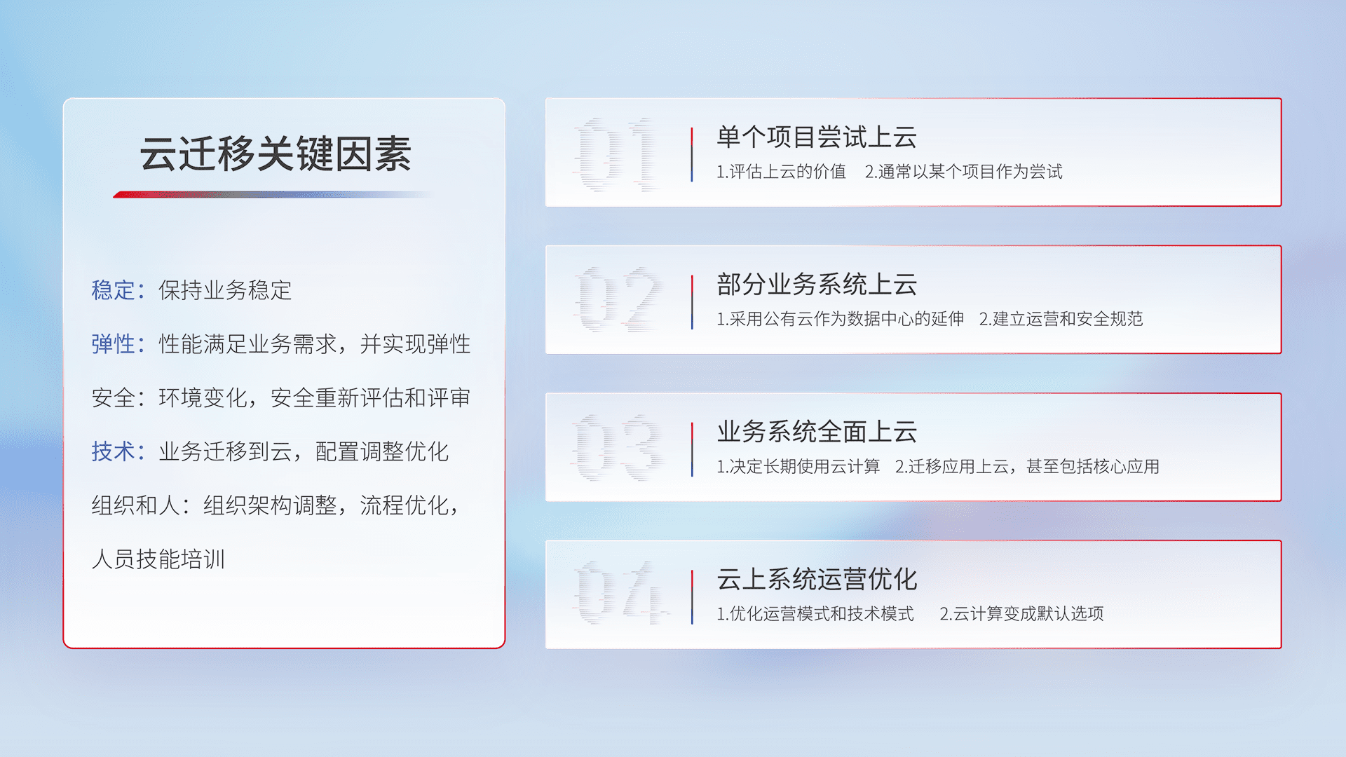 结合实际业务,,从规划设计、、云平台选型、、、云原生改造、、数据迁移、、、集成交付,,迁移全过程为客户识别最佳上云路径,,做好风险识别管理,,,,设计网络架构、、身份权限、、、、安全审计合规、、操作审计、、、日志审计、、、、监控告警策略、、多站点容灾设计等,,对云上基础设施进行整体规划,,,,提升IT治理水平,,,以满足弹性、、、高可用、、、高性能的需求。。