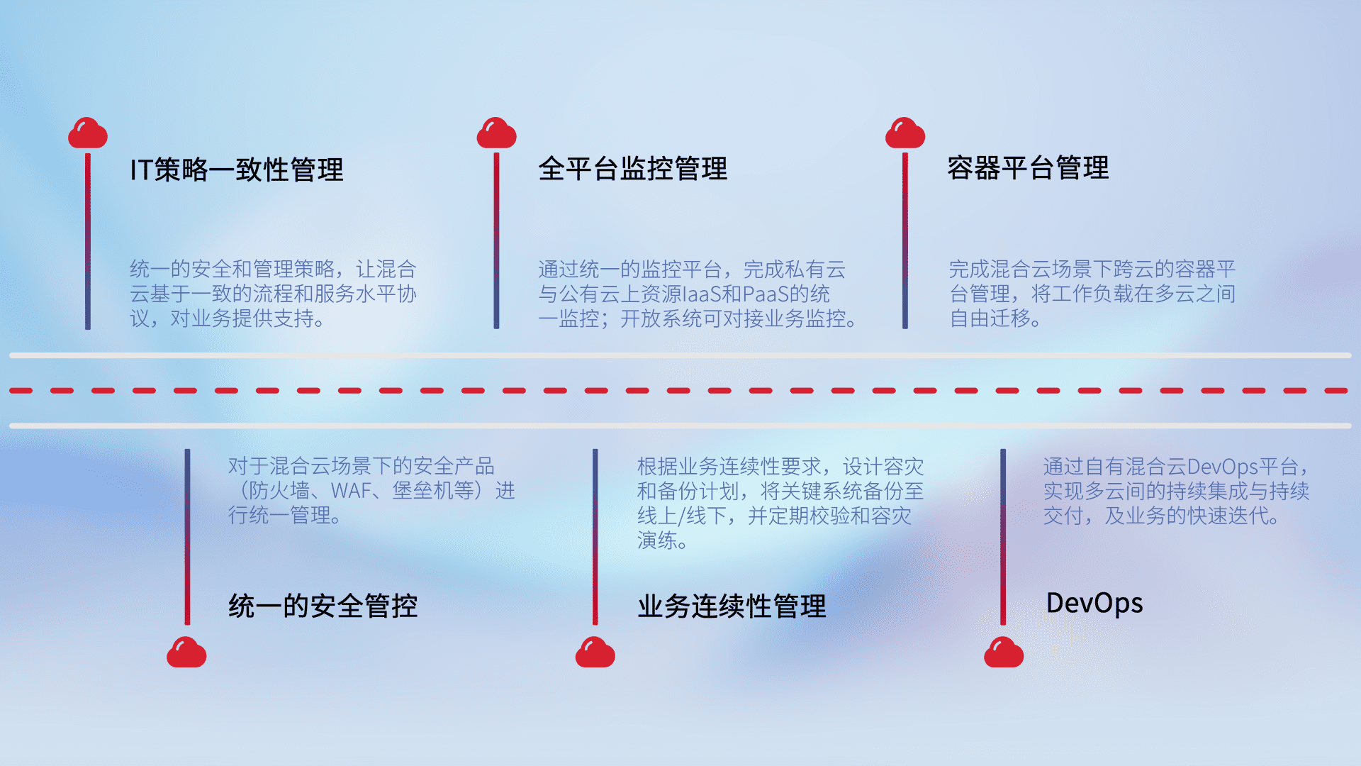 通过多云纳管,,以统一的资源数据模型把客户的云资源进行抽象和封装,,,,进而实现对多云资源的统一操作,,,保障云资源管理的可靠性、、稳定性与可用性。。。。量身定制化运维内容,,配置、、开发运维、、、补丁管理、、、、备份、、、、监控、、、认证和访问管理、、、审计和日常巡检等,,,,保障在用云过程中的可靠度,,,稳定度以及高可用率。。。