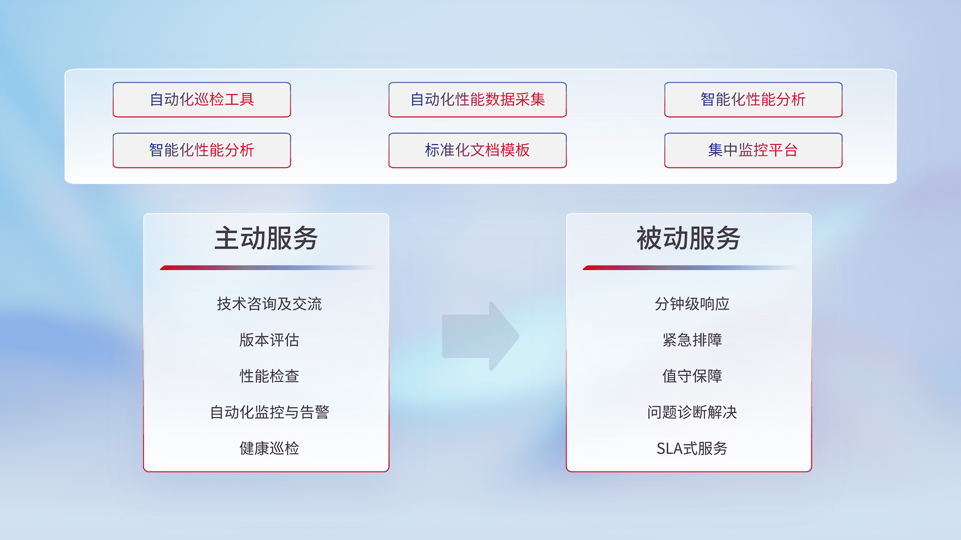 智能化工具和标准化文档,,保障服务质量,,,,提供主动服务(包含技术咨询、、版本评估、、、性能检查、、自动化监控与告警、、、、健康巡检)和被动服务包含(分钟级响应、、、紧急排障、、、值守保障、、、、问题诊断解决、、、SLA服务)。。。。